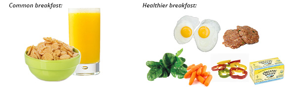 Better Breakfast Option: 2 eggs, 1-2 turkey sausages, 1 cup of spinach, peppers, carrots, a bit of butter with a small piece of fruit on the side. Switching to this high-protein, low-sugar breakfast provides steady energy, reduces blood sugar spikes, and will decrease cravings throughout the day.