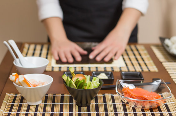 - Layer your ingredients of choice to make your roll (chicken, salmon or shrimp plus vegetables).